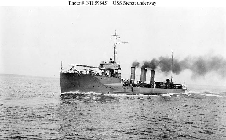 In April 1917, the United States entered World War I, and by 9 June, Sterett was in Queenstown, Ireland.  Throughout the remainder of the war, she operated from Queenstown to meet convoys and conduct them to either Berehaven, Ireland, or to Devonport, England.  At these points, British and French destroyers assumed responsibility for the last leg of the voyage.  A little less than a year after her arrival at Queenstown, on 31 May 1918, Sterett was herding a convoy toward the rendezvous point when she came upon a surfaced U-boat.  As Sterett closed, the submarine rapidly submerged.  Sterett began dropping depth charges furiously, and air bubbles and oil soon appeared on the surface, indicating damage to the German raider.  After exhausting her supply of depth charges, Sterett pursued the enemy by the U-boat’s wake of bubbles and trail of oil, hoping to force her to exhaust her batteries and air supply.  She continued the pursuit through the night, guided in the darkness only by the fumes of the sub’s leaking oil.  Finally, at dawn, the destroyer’s persistence was rewarded.  She sighted the U-boat on the surface about 1,000 yd (910 m) ahead.  Sterett sliced through the waves at top speed seeking to ram the submarine, but the U-boat countered by swinging hard to port.  Sterett passed within 20 ft (6.1 m) of the submarine and, as the U-boat attempted to dive, brought her guns to bear.  However, without sufficient time to bracket their adversary, Sterett’s gunners watched helplessly as the submarine slid beneath the surface and escaped.  For their dogged determination, the officers and men of Sterett received the commendation of the Commander-in-Chief, Coast of Ireland.
